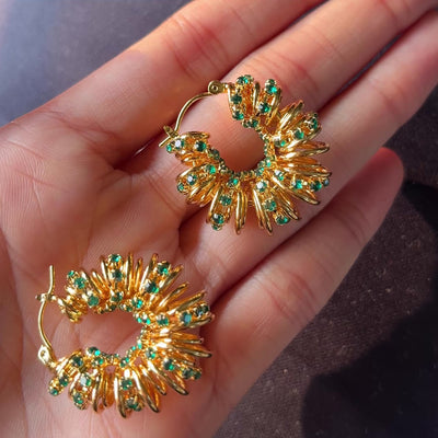 Meet your new everyday statement piece. The Raya Twist Hoop Earrings bring a modern, sculptural spin to a classic silhouette. Crafted with a swirling, textured design, each hoop is adorned with delicately set green rhinestones that catch the light from every angle - adding just the right amount of sparkle.